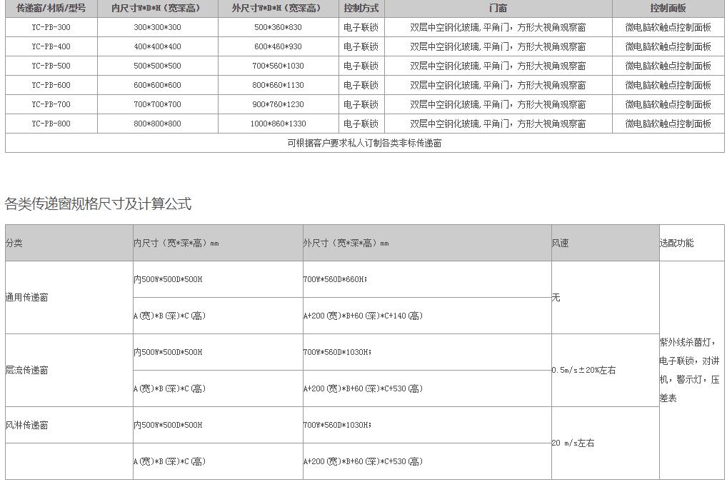 层流洁净传递窗、风淋传递窗传递窗技术规格参数