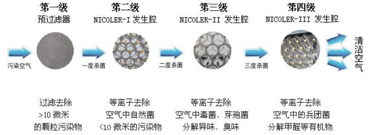 发生腔产生逆电效应,生成大量的NICOLER 高能离子体。在负压风机的作用下,污染空气被抽进发生腔内,