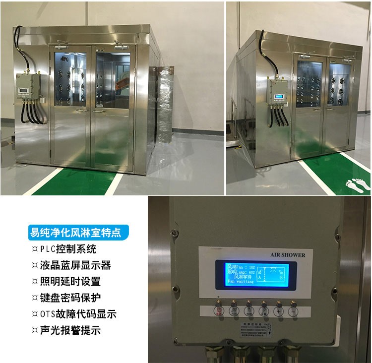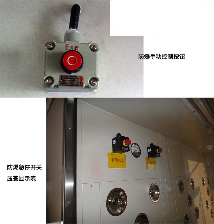 防爆风淋室特点为;人性化智能编程微处理控制器,提供极大程度上的方便性、专用性和安全性控制。采用高端的阿基米德螺旋型设计的送风系统提供25m/s--30m/s风速, 防爆风淋室风机一般采用防爆离心式风机,此类型风机分为Ⅰ型(直联式)和Ⅱ型(隔舱式)两种结构。整机结构均为无火花型结构。 Ⅰ型(直接式)防爆离心式风机制成防爆电动机直接传动式结构,叶轮直接装在电动机轴上,机壳固定在防爆电动机法兰上。 Ⅱ型(隔舱式)为防爆离心式风机和电机分隔舱结构,由风机、传动机、弹性联轴器、电动机等组成;传动组由轴承体、轴承、轴、铜环、密封填料函等组成,能测温加油。一端直联防爆离心式风机,一端直联隔舱壁。确保进入洁净室的人员及货物达到彻底除尘的效果。另外有全自动控制运行,双门电子互锁,感应自动吹淋。
