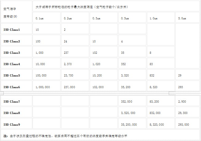 空气洁净度等级洁净室及洁净区空气中悬浮粒子洁净度等级: